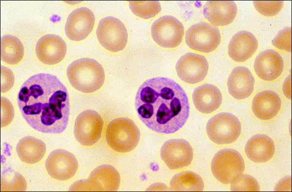 This is the most common polymorphonuclear leukocyte (the other two being the basophil and the eosinophil). The name stems from the relatively neutral color that its granules have when routinely stained. The neutrophil arises from the bone marrow and is fully mature when it is released into the circulation. It is, therefore, fully prepared to function in its role as the first line of cellular defense. It becomes activated, i.e., augmented in its ability to perform many of its functions, by exposing it to certain proinflammatory mediators and the chemotactic factors that attract it to the site of an inciting stimulus. It it voraciously phagocytic -- to the extent that it, along with the macrophage -- has been termed a "professional" phagocyte, thereby distinguishing them from other cell types that are capable of ingesting things, but not to the same extent
