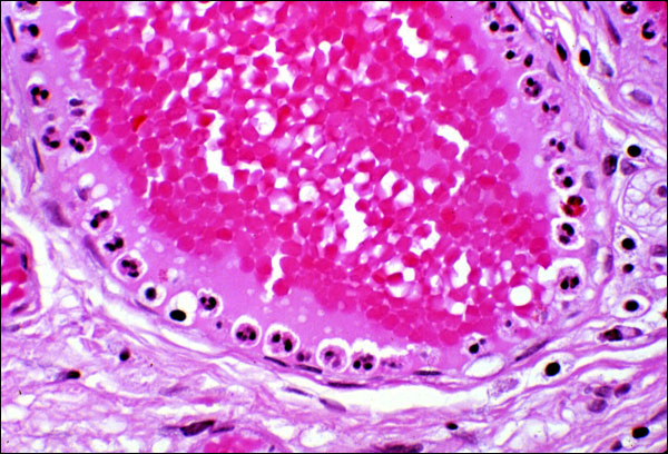 While you have a cartoon in the right panel of text Fig. 2-14 that depicts margination and adherence, it's not as impressive as the real thing. Note in the accompanying photomicrograph here that neutrophils literally line the endothelial surfaces of this vessel. This must have been a very early stage in the inflammatory reaction, because none of them is yet extending a pseudopod through the vessel's wall, thereby initiating the process of diapedesis (transmigration).