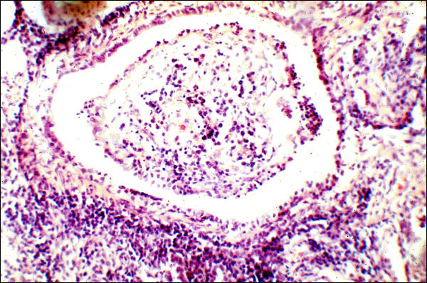 This slide is a photomicrograph of a section of lung afflicted with bronchiolitis obliterans. This is the result of chronic inflammation and is literally the plugging of bronchioles with fibrous connective tissue. Thus, fibrosis can just as well cause loss of function by adding fibrous connective tissue where it doesn't belong -- in this case, in an airway -- as by constriction.