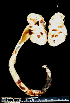 The is a gross photograph of a fibrotic so-called, end-stage, kidney and its attached, extremely altered ureter. Chronic inflammation has altered this kidney to the extent that it would be next to impossible to determine the original inciting cause of the inflammatory problem. There has been extensive loss of parenchyma and extensive fibrosis. This kidney and ureter depicts for you how extensive the damage from chronic inflammation can be. There is no doubt that the 5th cardinal sign of inflammation, loss of function, is operative here.