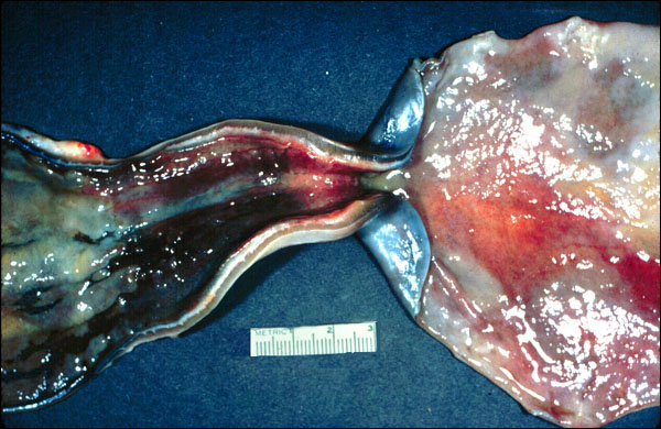 This slide is a gross photograph of a segment of small intestine afflicted with fibrosing enteritis. A "napkin ring", i.e., circumferential, scar formed that, as it contracted, blocked the flow of ingesta (loss of function). Note that the bowel to the right -- the upstream side -- of the constriction is dilated, compared to that which is on the left