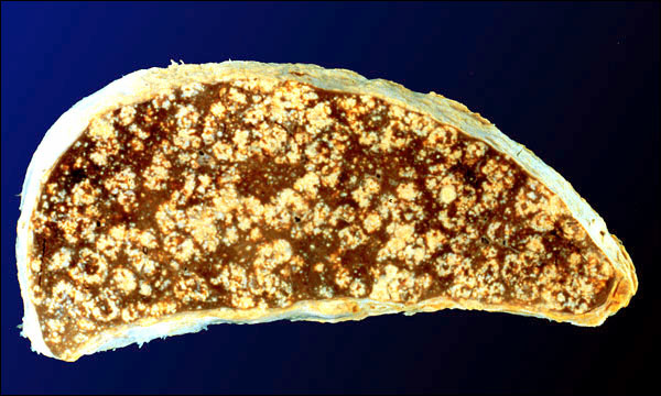 This is a cross section of a spleen from an individual with miliary tuberculosis. Tuberculosis is one of those diseases that has as its hallmark the formation of granulomas. The descriptive term, "miliary" stems from the fact that the granulomas here are very numerous and small, each one resembling a millet seed. You can discern the thick splenic capsule surrounding this piece of formalin fixed tissue, and the brown splenic pulp (it would be redder, were the tissue unfixed). The granulomas are the numerous cream-colored, roughly circular structures that are scattered throughout the splenic pulp. Microscopically, they would appear similar in their structure to the granulomas that are depicted in your text Fig. 2-25. The exception is that, in tuberculosis, the center of the granuloma is often necrotic (caseous necrosis), while in sarcoidosis, the granulomatous disease depicted in the text figure, they are non-caseating granulomas