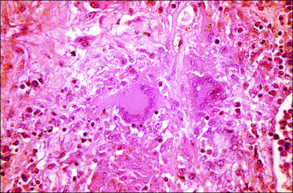 This is a photomicrograph of a so-called Langhans-type giant cell. Giant cells are given the Langhans name when their nuclei form either a horseshoe pattern (center) or a complete circular pattern (right).