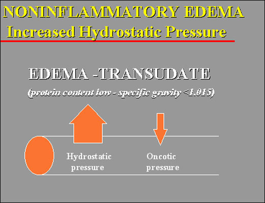 Under the conditions summarized in this chart, oncotic pressure is normal but hydrostatic pressure is increased, to the extent that excessive amounts of fluid are forced out of the circulation. An example of a clinical problem that is the result of this pathogenetic mechanism is pulmonary edema secondary to left-sided heart failure.