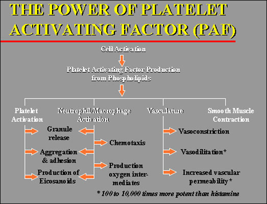 The point from this chart is that this one mediator has a wide range of biological effects. This is true of many mediators, e.g., interferon-gamma, interleukin-1, and tumor necrosis factor-alpha. In addition, mediators like PAF synergize with other mediators to accentuate the biological effects of those other mediators. You will also recognize that many of the proinflammatory effects that PAF has are shared by other, entirely different mediators. This is evidence of the redundancy that characterizes, not only the systems of the space shuttle, but also cytokine networks.