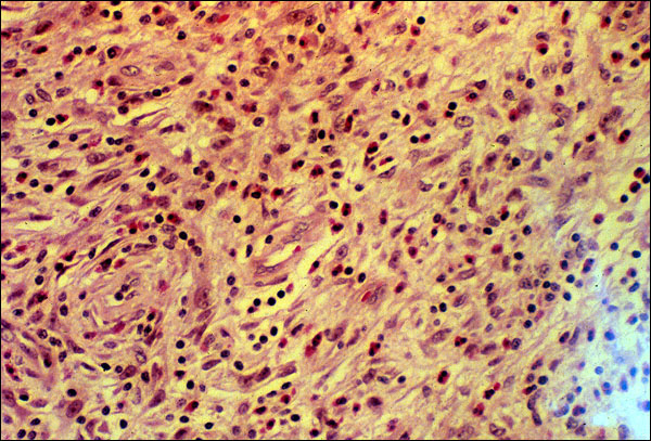 Chronic-active inflammation. The inflammatory response is a dynamic, changing thing. Thus, there are transitional stages, during which the response is changing from one major type of inflammation to the next. This photomicrograph shows the transition between acute and chronic, which is often referred to as chronic-active. Note that there are both polymorphonuclear leukocytes and mononuclear cells (lymphocytes and macrophages). The latter cell types are the hallmarks of chronic inflammation. Another hallmark, not described in your text, is the production of fibrous connective tissue, which is in its earliest stages in this lesion.Note that the hallmarks of acute inflammation have markedly diminished by this stage.