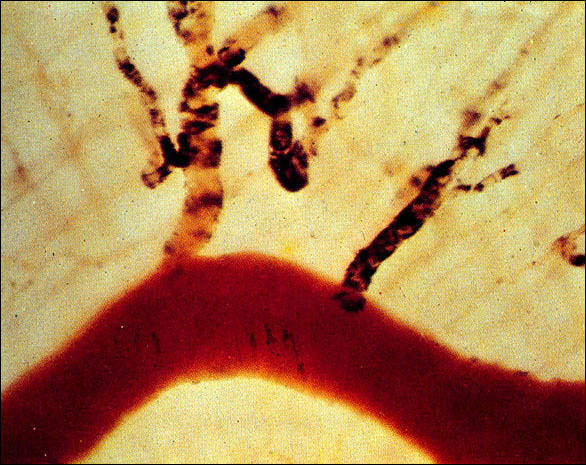 This is a photomicrograph of living tissue to demonstrate which vessel(s) become leaky after the experimental injection of histamine. The animal was first injected with carbon particles, after which histamine was given. After several minutes needed to allow excess carbon particles to clear from the circulation, only one kind of vessel had carbon particles in its wall: the postcapillary venule. You can clearly see that here, where the red, relatively large diameter venule at the bottom has no labeling of its walls; the capillary bed in the background has little or no labeling; but the connecting, postcapillary venules have taken up significant amounts of the label. Note how sharp the cut-off is: you can actually see the carbon-labeling stop, making a sort of footprint, where the postcapillary venules join the larger caliber venule.