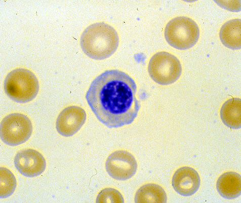 The nucleated RBC in the center of the slide shows basophilic cytoplasm and a round nucleus with densely clumped chromatin. Nucleated RBCs are not normally present in the peripheral blood.