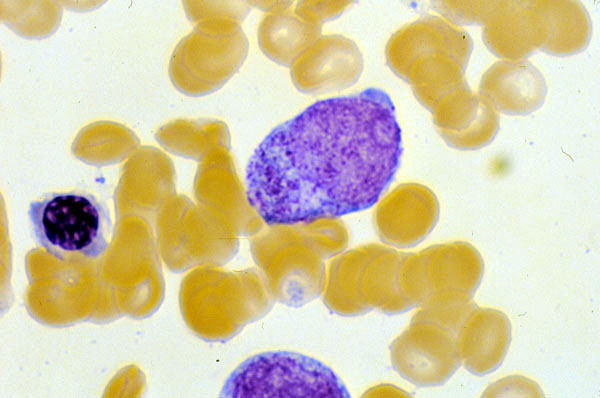 which contains abundatn red (Azurophilic) cytoplasmic granules and an oval nucleus with fairly finely dispersed chromatin.