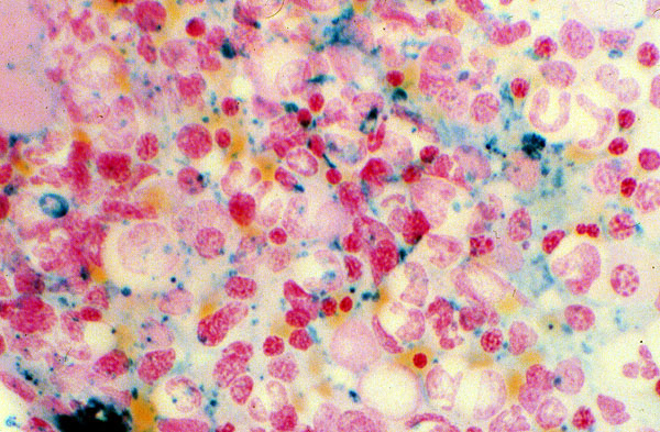 Normal iron stores, prussian blue stain, bone marrow aspirate