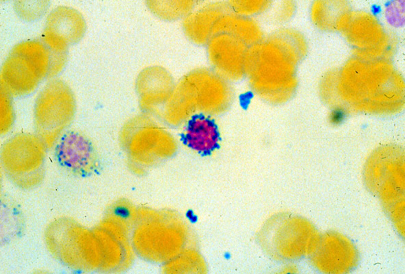 This erythroid precursor shows the presence of dark ble iron granules in a ring entirely surrounding the nucleus. This represents an abnormal location of iron in mitochondria. Sederoblastic anemia is a heterogeneous group of disorders associated with ineffective erythropoiesis.