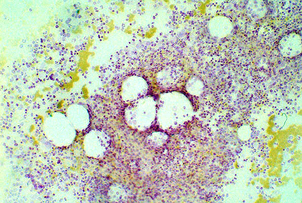 This bone marrow aspirate contains no detectable iron, which is a reflection of iron deficiency in an adult. Iron should stain blue in the Prussian blue reaction.