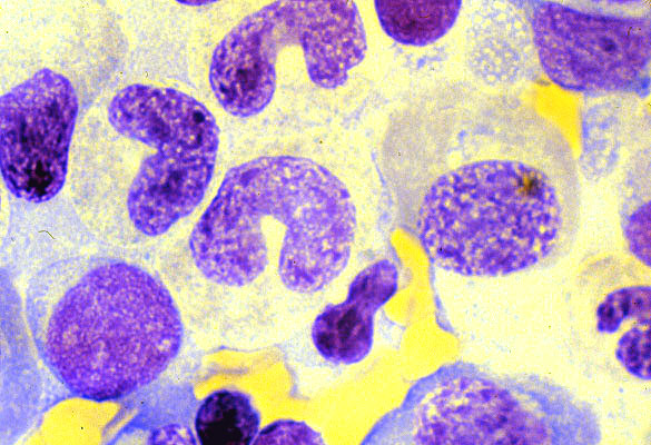 The granulocytes show megaloblastic features, with nuclear-cytoplasmic asynchrony. Note the presence of a giant metamyelocyte, a charactoristic finding.