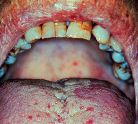 A person with idiopathic (immune) thrombocytopenia purpura has petechia on the tongue and palate. Petechiae are small pin-point hemorrhages of small capillaries in the skin or mucosa, and are seen primarily in defects of platelet plug formation.