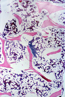 This bone marrow biopsy shows an atypical lymphoid aggregate located in the paratrabecular region, a typical finding when a follicular lymphoma involves the bone marrow. Low grade lymphoma involves the bone marrow in approximately 60% of cases, and the quantity of marrow involvement is an important feature in staging the extent of the patient's disease.