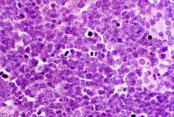 This slide shows a monotonous population of neoplastic cells which have fine chromatin and lack nucleoli. Note the high mitotic rate. Lymphoblastic lymphoma is a high grade lymphoma, and represents the solid tissue counterpart of acute lymphoblastic leukemia.