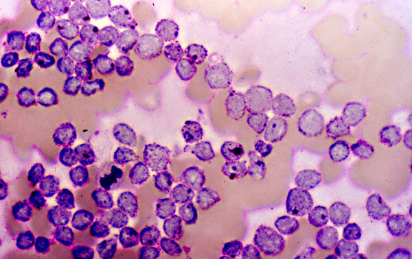 The blasts show strong positive reaction for PAS, observed as pink granules and globules in the blast cytoplasm ("block PAS positivity". This pattern of PAS reaction is characteristic of lymphoblasts, and represents intracytoplasmic glycogen. This leukemia had a precursor B phenotype, and the patient is now in complete remission