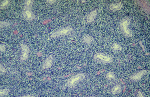 This slide shows residual atrophic seminiferous tubules which are surrounded by a dense infiltrate of leukemic blasts. The testis is a common site of leukemic relapse in males with ALL. This patient had a T- cell ALL, and presented with a WBC count of 230,000/ul.