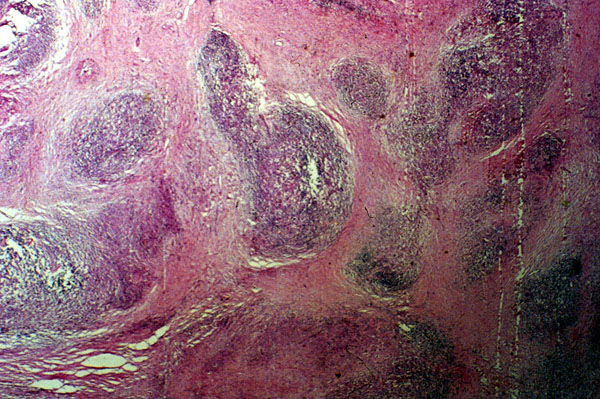 This low power view of the lymph node shows broad bands of