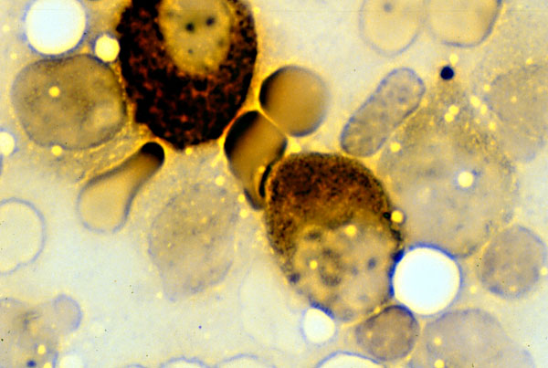 This slide shows the leukemic cells to be strongly positive for myeloperoxidase, as observed by the dark brown staining cytoplasmic granules.