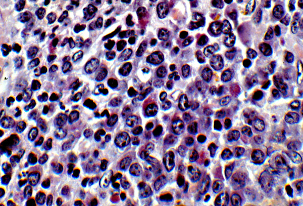 Granulocytic sarcoma is an extramedullary proliferation of neoplastic hematopoietic cells. It can show various stages of maturation. In this slide, there is a mononuclear cell infiltrate composed of fairly undifferentiated cells. Admixed eosinophilic myelocytes are present, which are often a histologic clue to the diagnosis of granulocytic sarcoma.