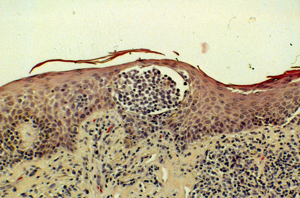 Mycosis fungoides displays a feature termed epidermatrophism, which refers to migration of the neoplastic T-cells up into the epidermis. This slide shows hyperkeratosis, a band-like infiltration of the dermis by tumor cells and a characteristic intra-epidermal collection of neoplastic T-cells, termed a Pautrier microabcess.