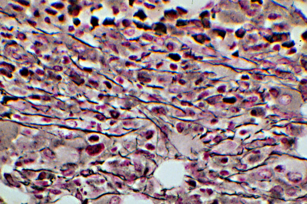 The reticulin fibers appear black in this special stain for reticulin. This bone marrow shows a diffuse, moderate increase in reticulin fibrosis. Increased fibrosis is a feature common to all chronic myeloproliferative disorders, but is the histologic hallmark of agnogenic myeloid metaplasia.