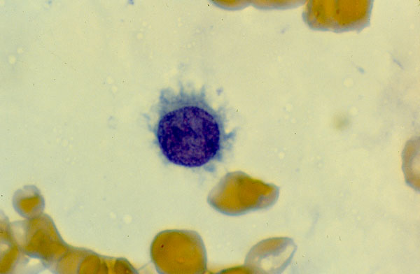 This is a high power view of a cell of hairy cell leukemia, which shows characteristic cytoplasmic projections. The cell has a mature chromatin pattern. The patient presented with pancytopenia and splenomegaly, typical of patients with hairy cell leukemia.