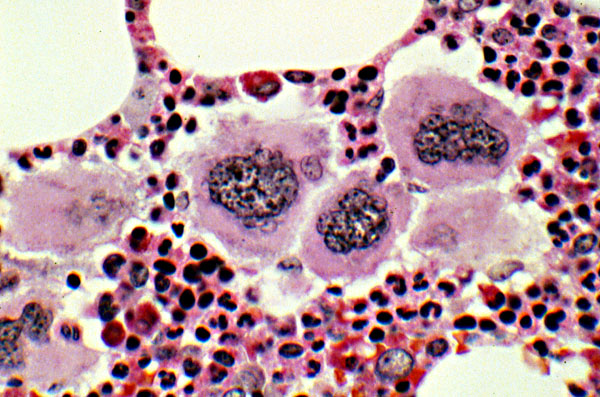 This medium power view of a bone marrow shows increased cellularity, with a cluster of abnormally large megakaryocytes, a finding typical of essential thrombocytosis. The surrounding hemopoietic cells are a polymorphous population of erythroid and myeloid precursors, with less that 5% blasts. There was minimal reticulin fibrosis.