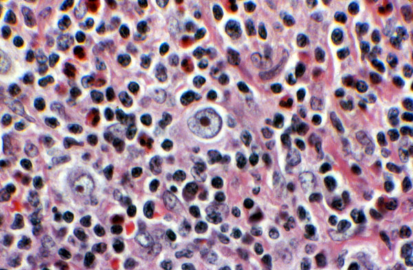 This cell has only one nucleus, and is termed a mononuclear variant Reed-Sternberg cell. Note the background cellular constituents, which include benign lymphocytes, eosinophils and plasma cells.