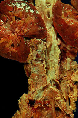 The lymph nodes in the para-aortic region are enlarged and show a homogeneous tan/yellow cut section. The patient had a history of small lymphocytic lymphoma.
