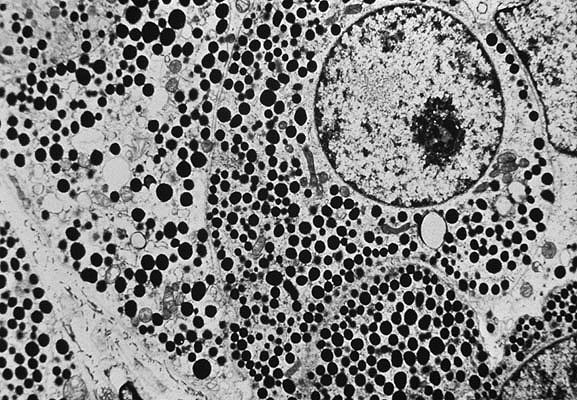 This electron micrograph shows secretory granules in anterior lobe cells (and their tumors). Granule size tells us something about the hormone in question. Alternatively (and more commonly), immunoperoxidase stains specific for each hormone are used.