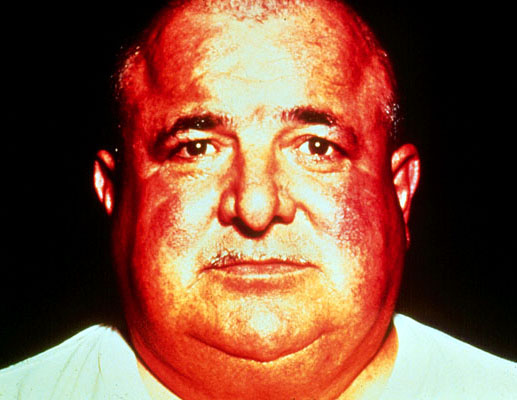 : Moonface with plethora (too many red blood cells), causing the face to be red.