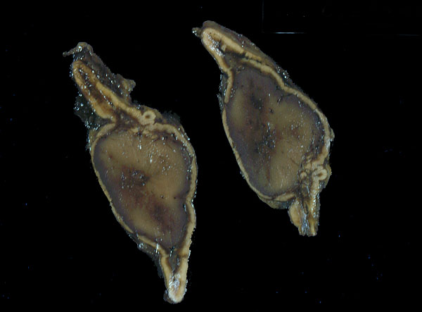 of adrenal medulla gross. Note spherical enlargement of the adrenal medulla in this cross section of adrenal.