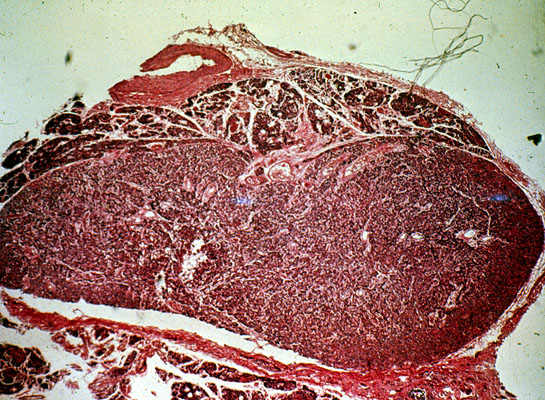 Parathyroid adenoma, whole mount, micro. Shows a well cirumscribed chief cell adenoma lacking interspersed fat cells, and surrounded by a rim of normal, fat-containing parathyroid tissue. These are usually solitary nodules of golden brown color, compressing adjacent normal parathyroid tissue.