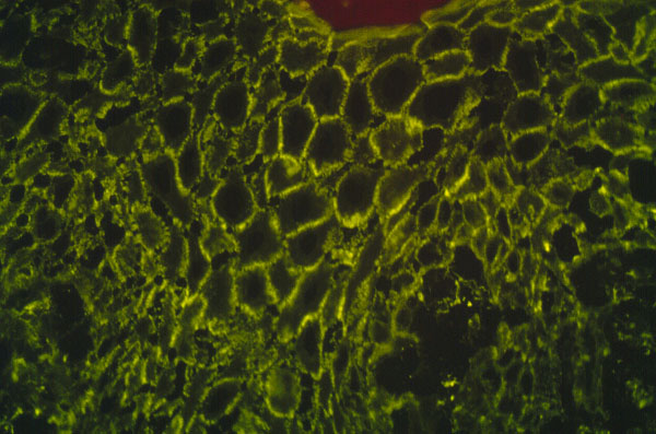 , micro, immunofluorescence stained for IgG, detected antibody is against epidermal cell surface.