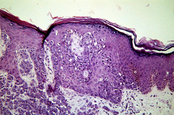 Vertical growth phase melanoma, micro, edge of the lesion showing the same scatter of individual cells above and below the dermoepidermal junction seen in the radial growth phase melanoma.