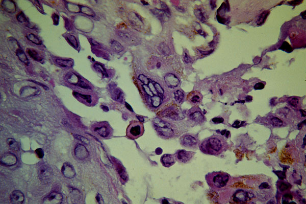 , micro, note the nuclear inclusions and multinucleated giant cells.