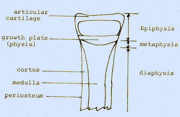 Anatomic regions of the long bone, diagram. Virtually all growth in length occurs at the growth plates.