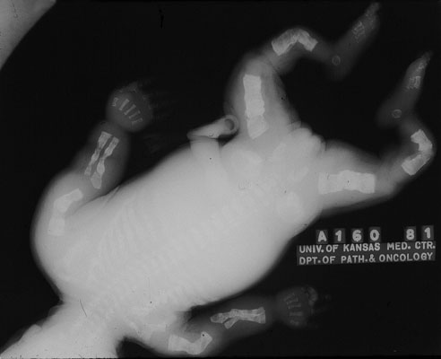 X-ray of newborn with O.I. showing multiple prenatal fractures leading to marked osseous deformity.