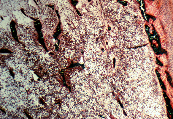 Non-decalcified microscopic section of rib in congenital 0.I. showing thinning of cortex and trabecular bone spicules. However, there is no defect of mineralization.