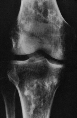 X-ray of multiple infarcts of the tibia and femur in caisson disease.
