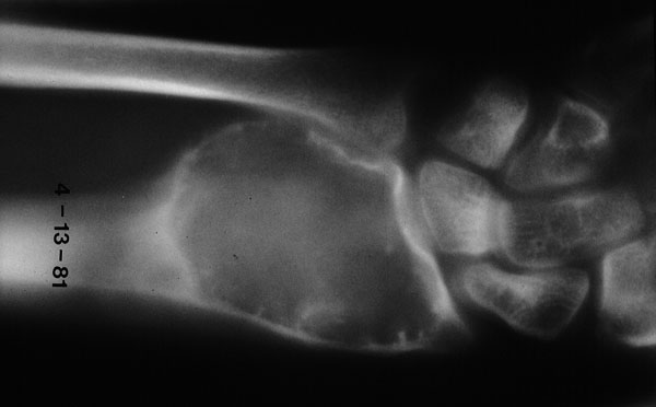 of bone in the distal radius of a 38 year old female. X-ray shows an expansile, radiolucent lesion arising in the