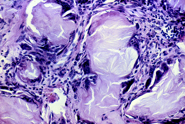 Radial clusters of acellular monosodium urate crystals eliciting a foreign body reaction, in