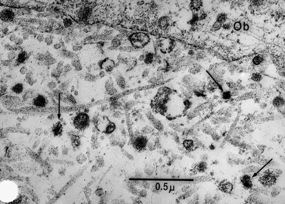 Matrix vesicles within osteoid, beneath the plasma membrane of an osteoblast (Ob), EM. Matrix vesicles initiate calcification in osteoid as well as in cartilage and dentin.