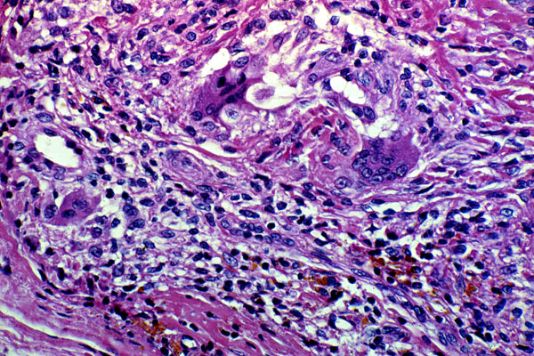 Microscopically, there are giant cells surrounded by a benign appearing stroma of fibroblasts and histiocytes.