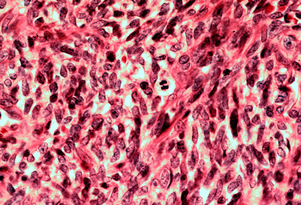 typically contains two components: malignant fibroblastic cells, shown in this slide, and epithelial cells.