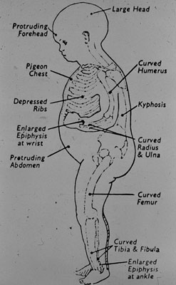 Diagram listing clinical features of rickets. In this condition, bone-bending and bone deformity results from inadequate mineralization of bone matrix, secondary to vitamin D deficiency.