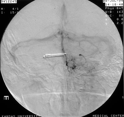 Same patient: postoperative arteriogram shows metal clamp applied during surgery, but aneurysm is no longer visible (this is digital subtraction angiography, which give a 3D effect. Everything is digitally subtracted from the image except the vessels of interest).