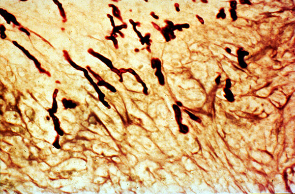 Brain, infarct, aspergillosis, micro, Grocott stain